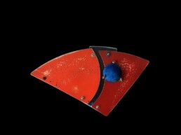 Auch jedes Alu Objekt ist Ergebnis einer Erforschung der Formen. Ursprünglich inspiriert von meinen Ketten, wollte ich wesentlich größere Versionen der Ketten entwerfen, außerdem aber mit gefundenen Objekten ergänzen. Die Basis der Stücke einer Assemblagen Gruppe ist aus Straßenschildern gefertigt. Wie die Ketten, ist jedes Stück ausgeschnitten, gefeilt und geschliffen. Jedes Stück wird mit Acryl lackiert. Nach dem Trocknen lege ich alle Stücke auf den Boden, um einen Überblick zu bekommen. So kann ich verschiedene Kombinationen ausprobieren. Diese Übung mache ich, bis ich zufriedenstellende Kompositionen gefunden habe. Dazu kombiniere ich Fundstücke als Kontrast zu den verschiedenen Farben und Formen.