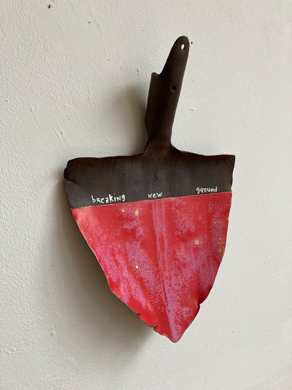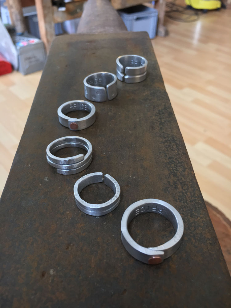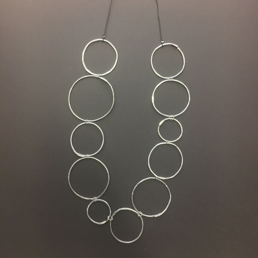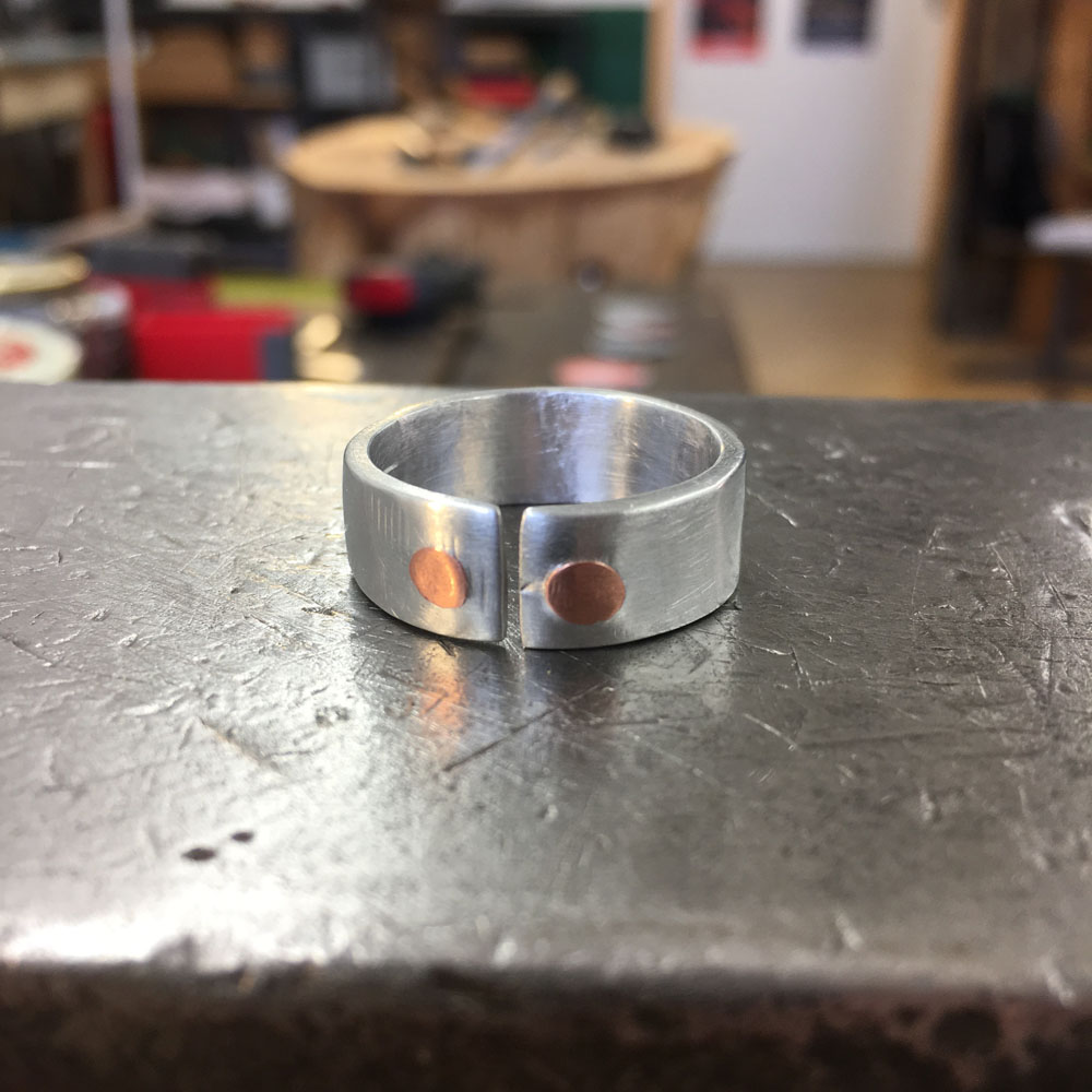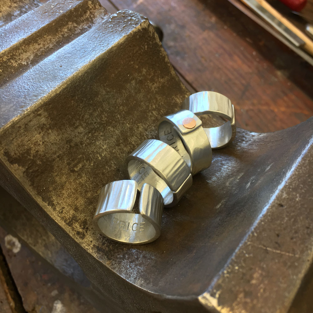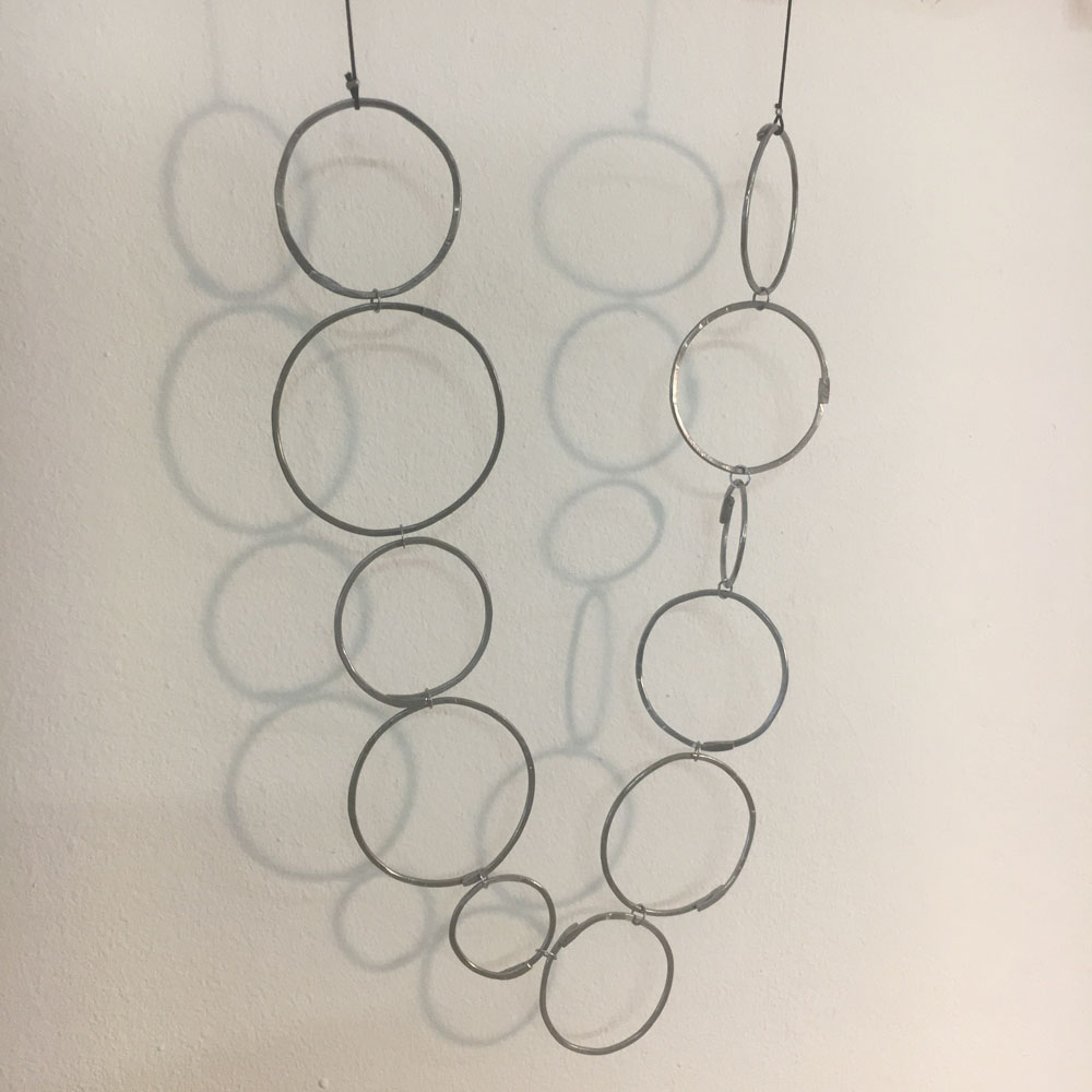 Die Draht Objekte sind eine Studie über Wiederholung und Geduld. Jedes Stück Draht, ob er lang oder kurz ist, wird flach gehämmert. Dieser Prozess dauert Stunden. Die endlosen Facetten sind ein wichtiger Teil des Prozesses. Die Oberflächenbearbeitung der gehämmerten Stücke gibt jedem Objekt eine reiche Tiefe. Die Facetten sind klein aber sie zeigen ein subtiles Muster.